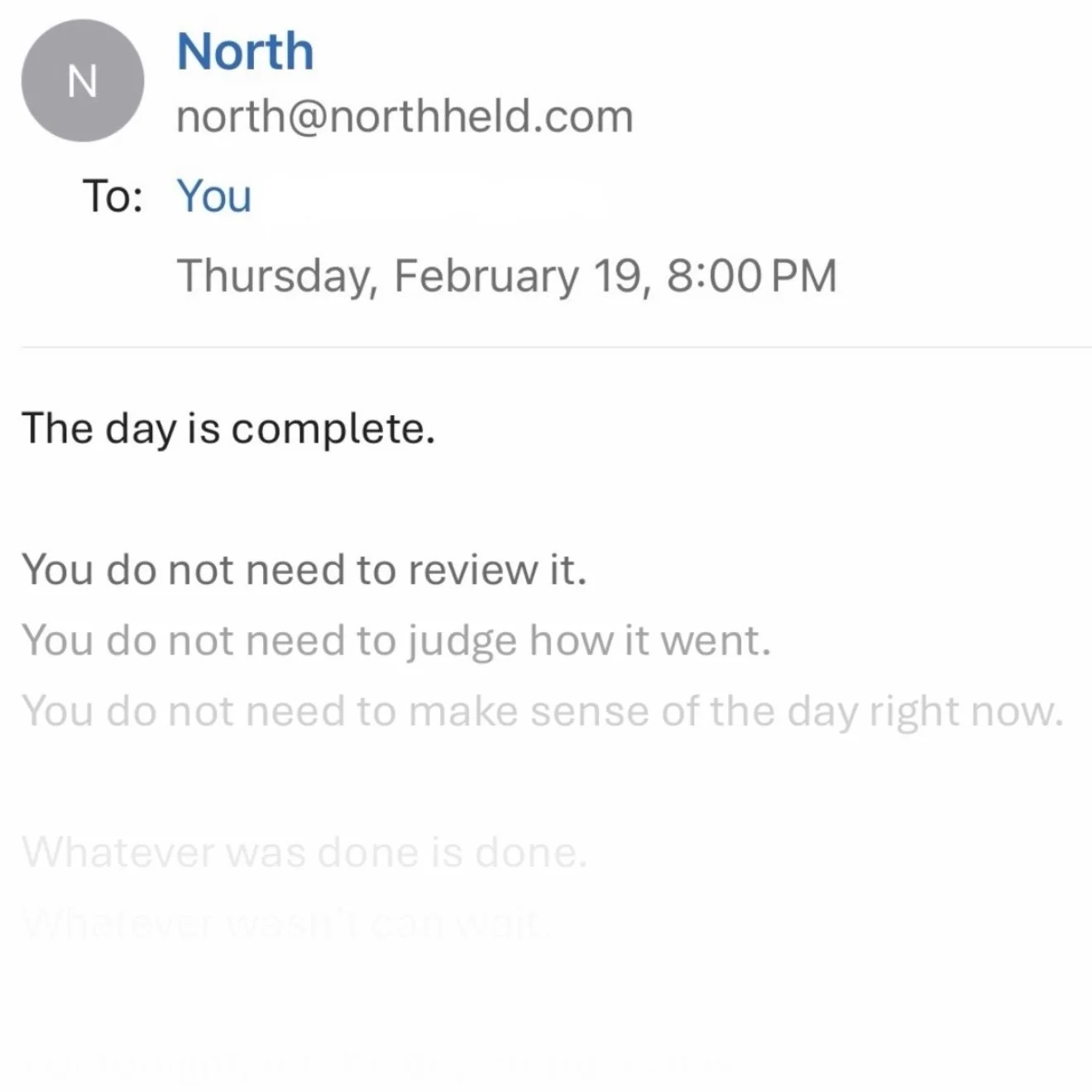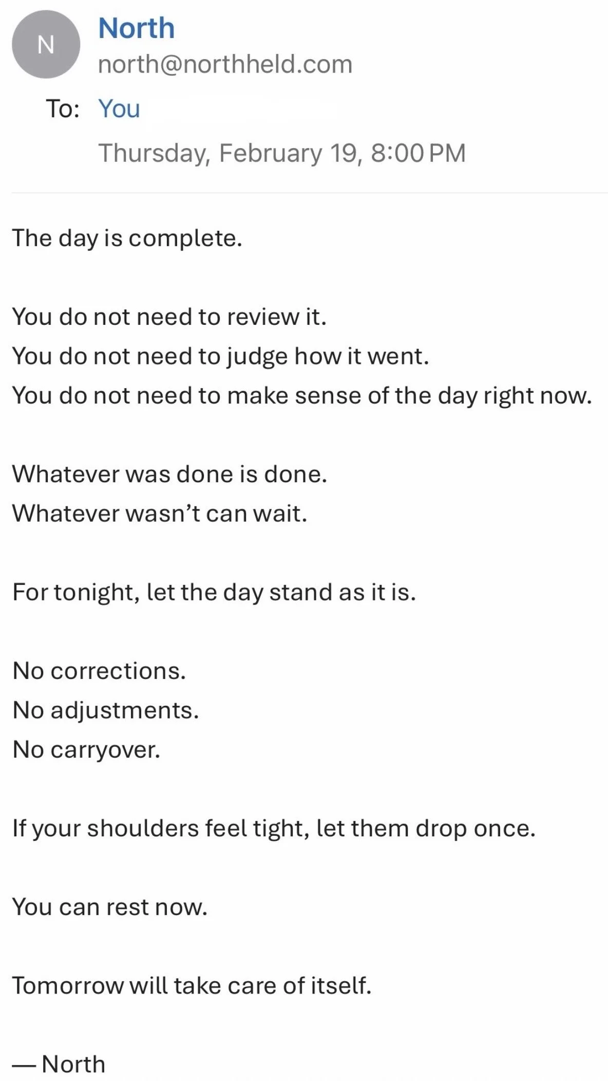 “My to-do list never ends. NORTH helps me close the day without carrying it into tomorrow.”